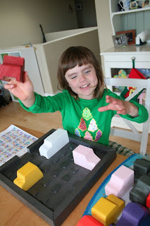 My sister got me addicted to the game Rush Hour on my iPhone (try the limited free version, or if you're on android here's the official one, or a free imitation). When I visited her this summer I saw she had a real physical version too. When I went to find it to buy it was $20 which was way too much for some plastic! So I decided to build my own and my daughter helped me. I thought about rolling wheels and other fancy stuff but for the first version I decided to keep it simple. In the end the wood for this version cost around $13.